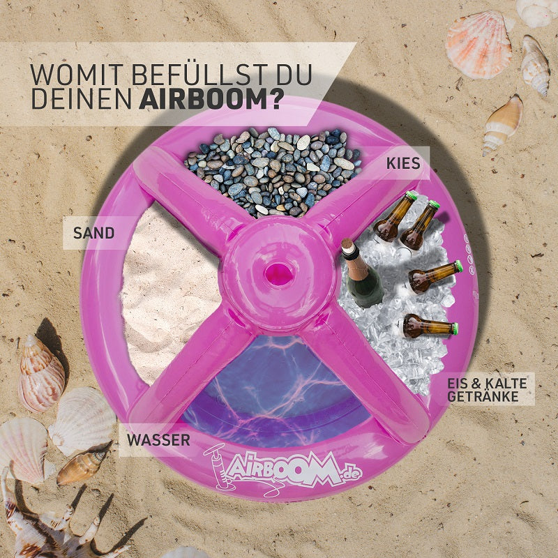 Airboom Pink mit Pumpe – Der aufblasbare Sonnenschirmständer mit Getränkekühler für den Strand